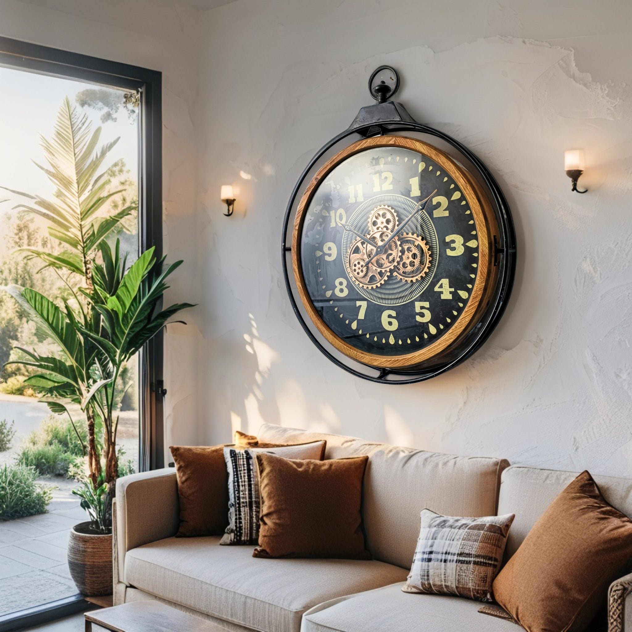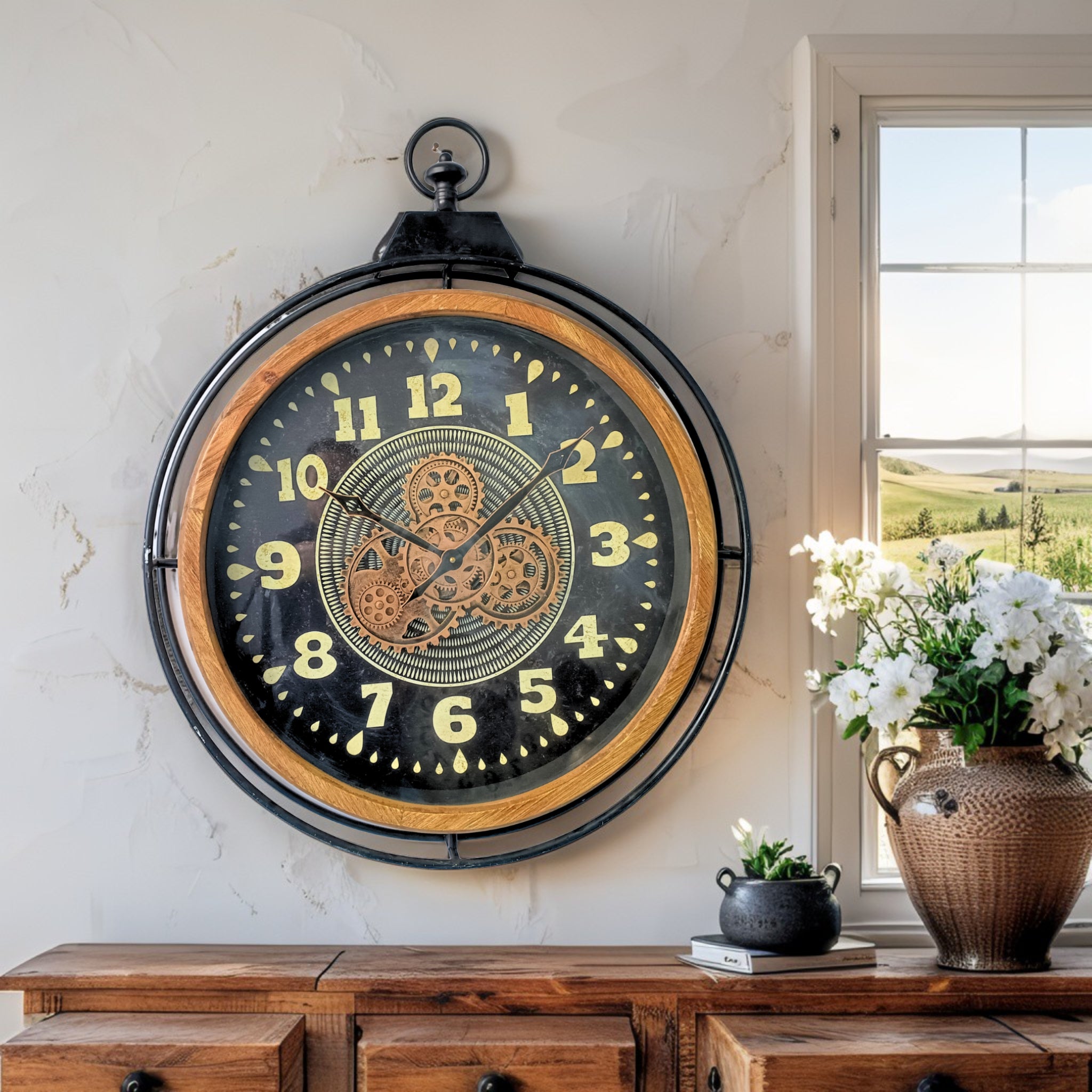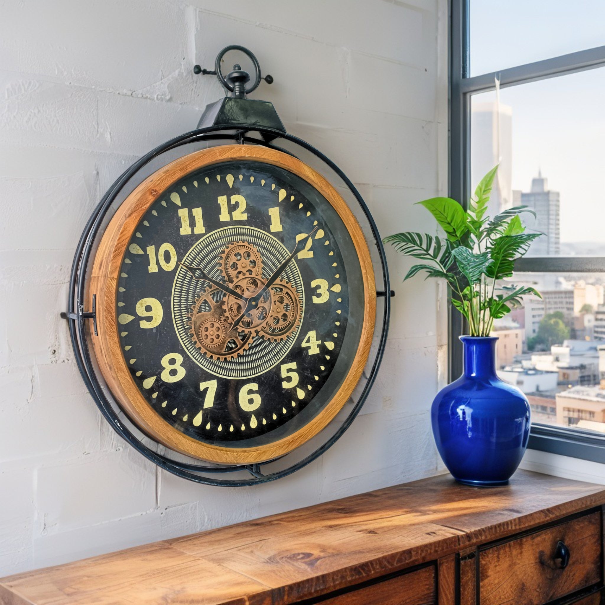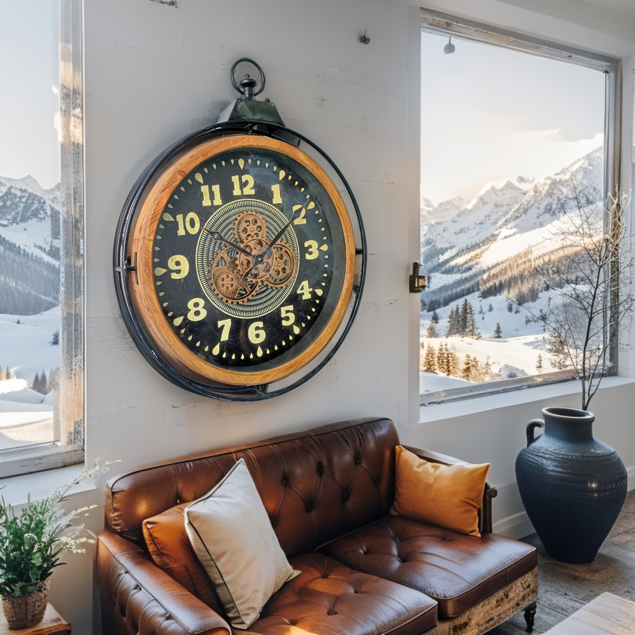 STYLE: industrial-modern; brown wood-look ring, brushed-silver bezel; glass cover.