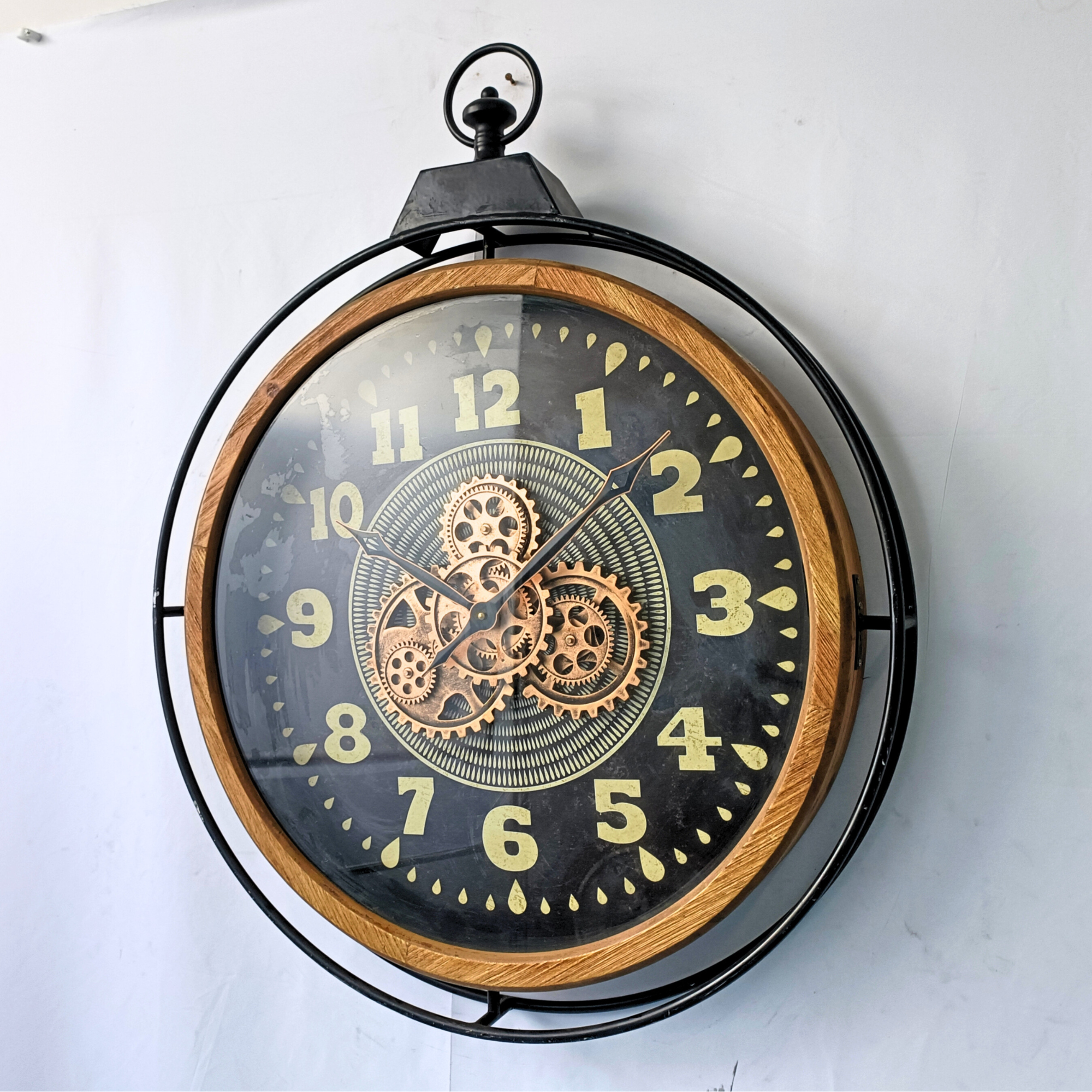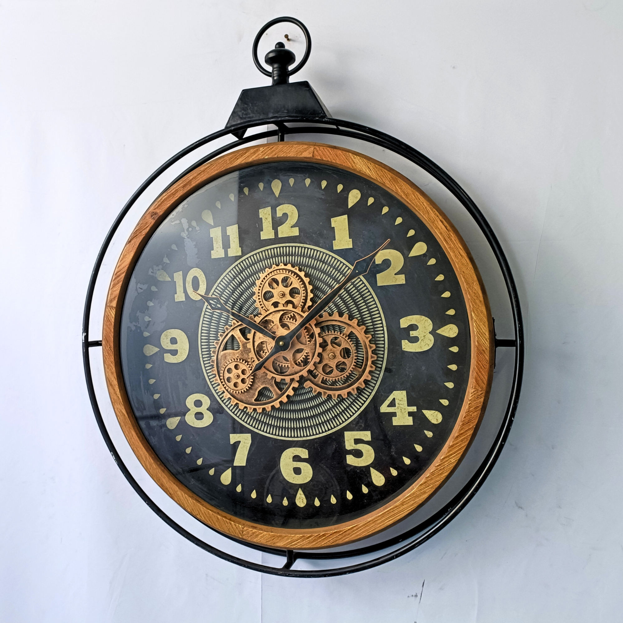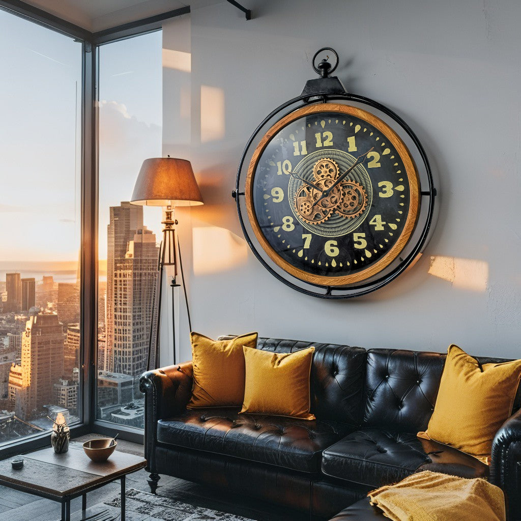 STYLE: industrial-modern; brown wood-look ring, brushed-silver bezel; glass cover.