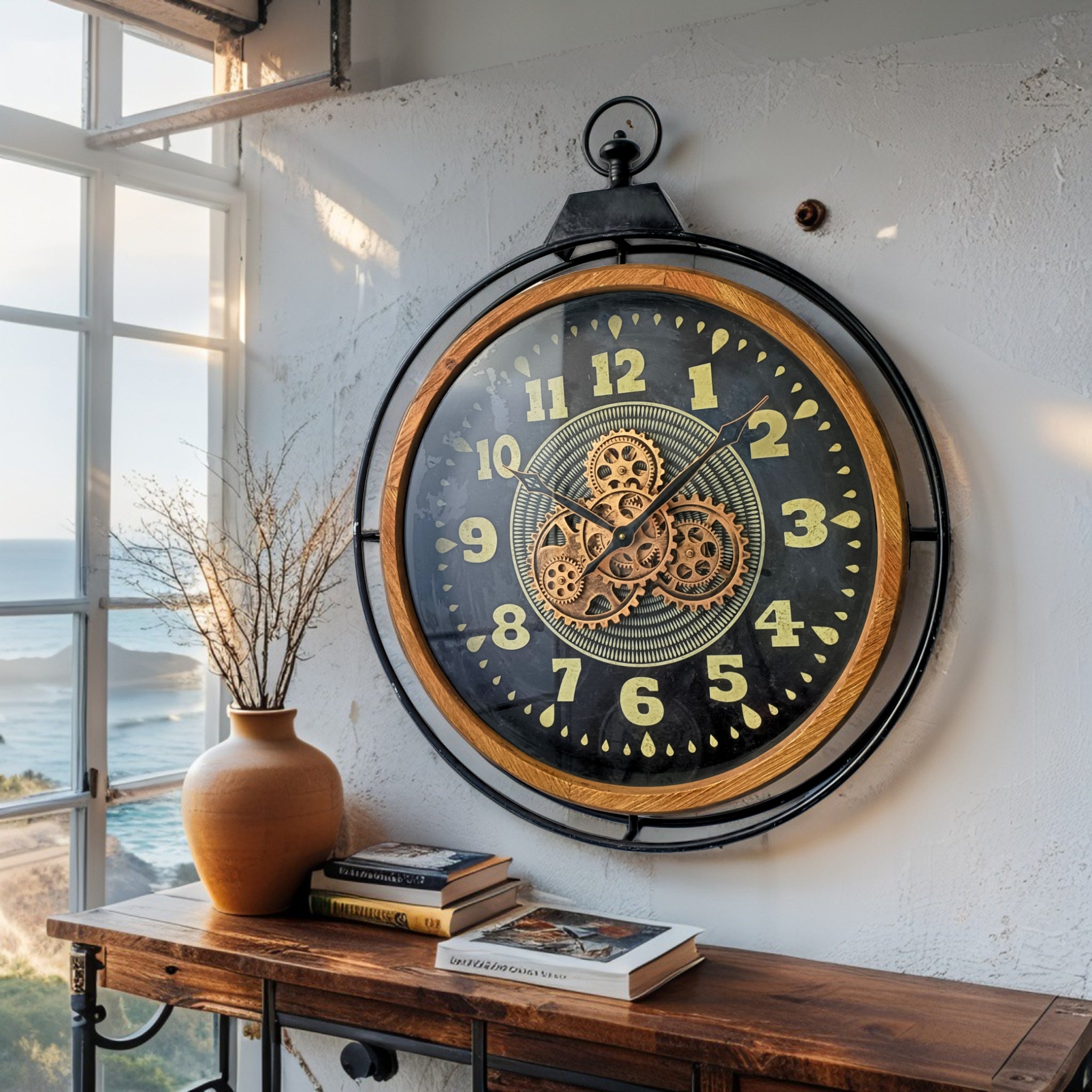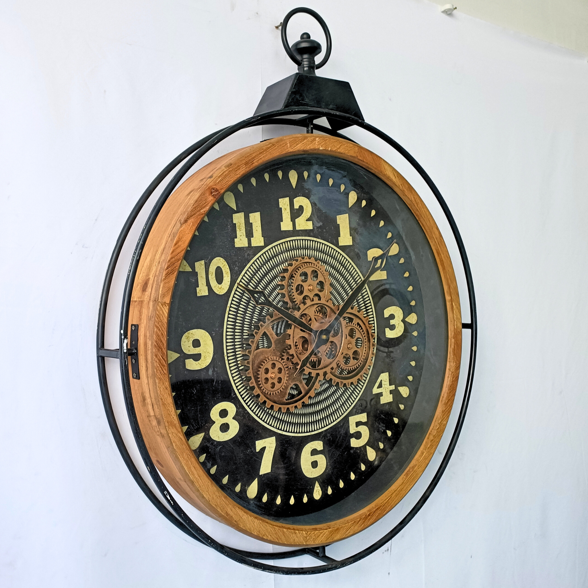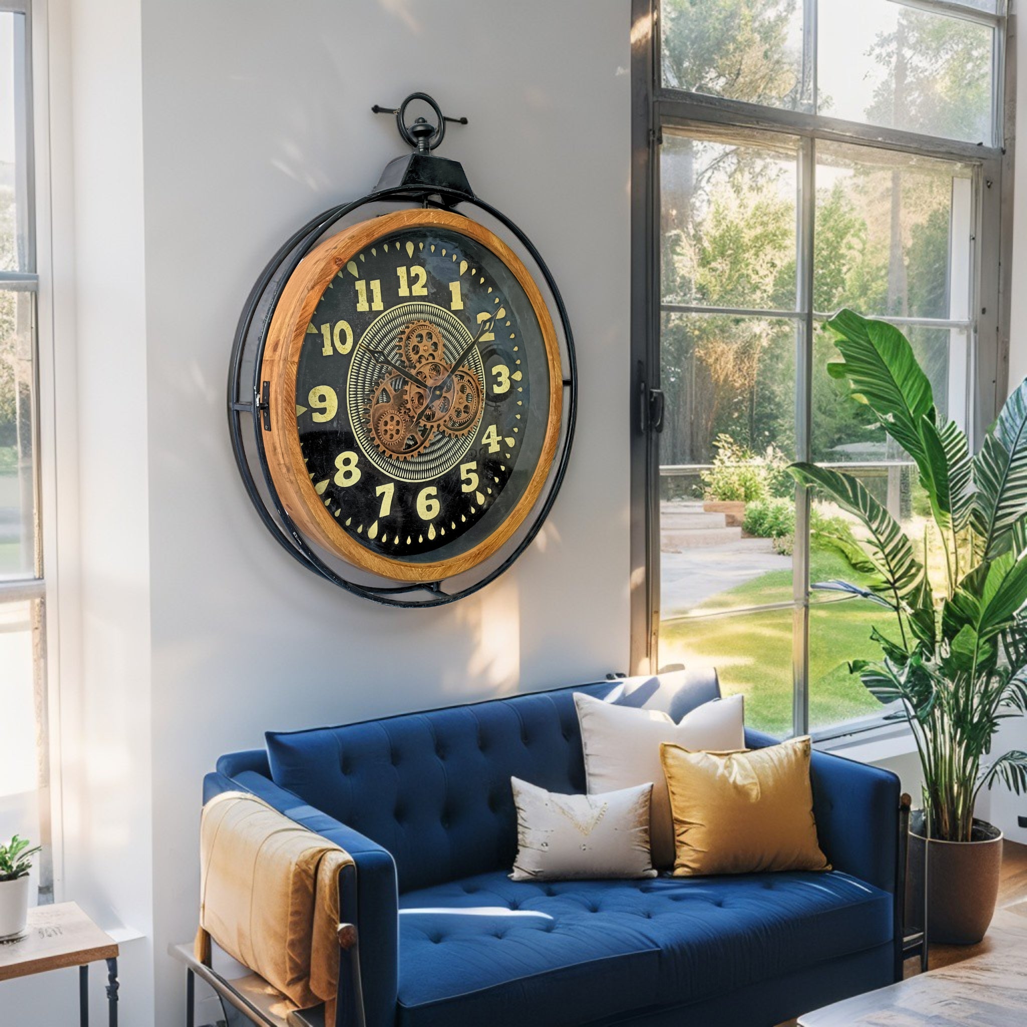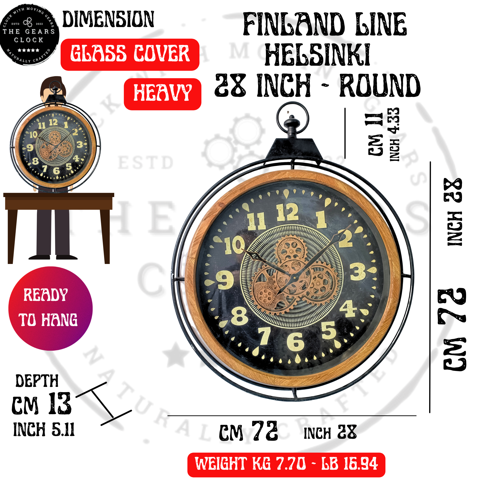 STYLE: industrial-modern; brown wood-look ring, brushed-silver bezel; glass cover.