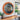 STYLE: industrial-modern; brown wood-look ring, brushed-silver bezel; glass cover.