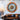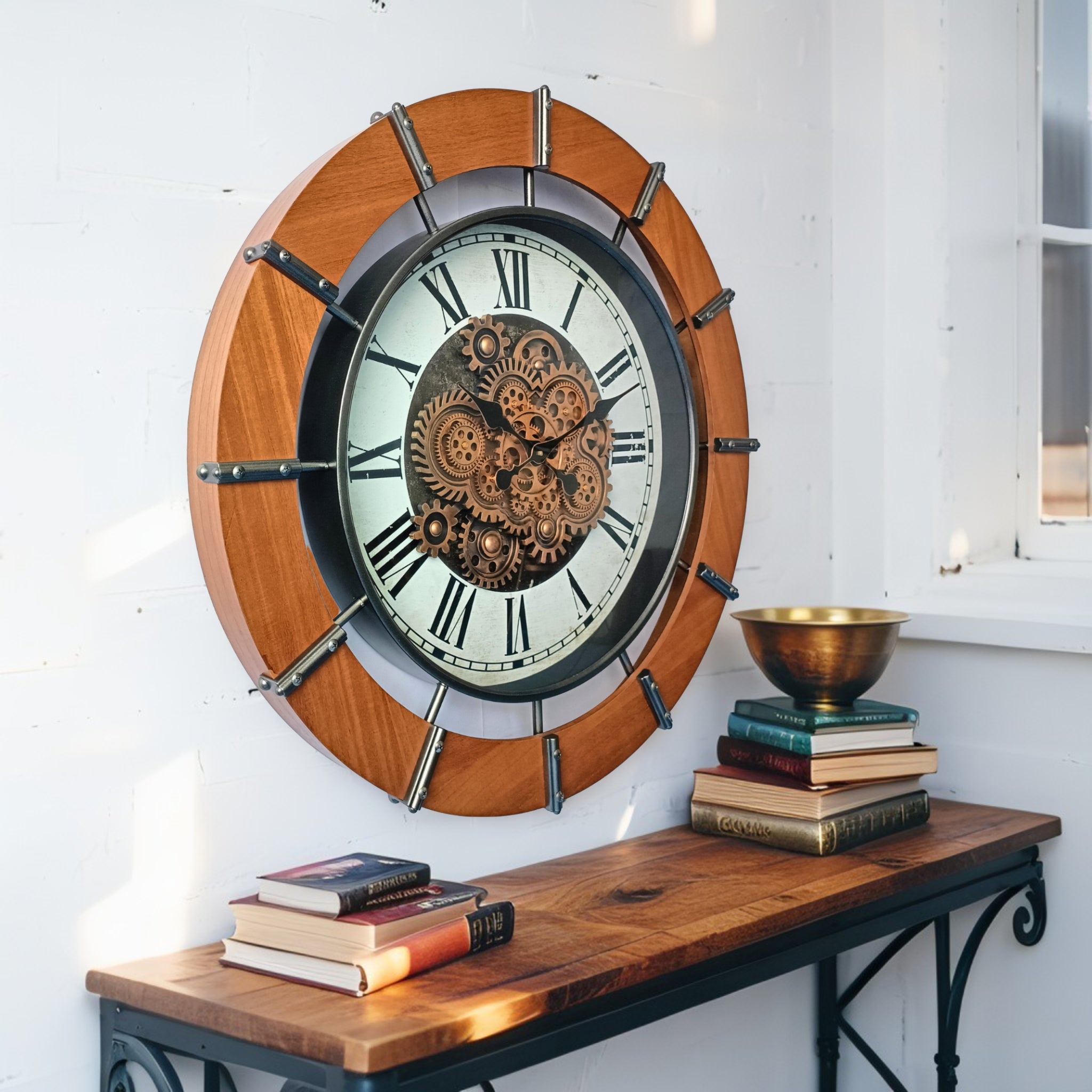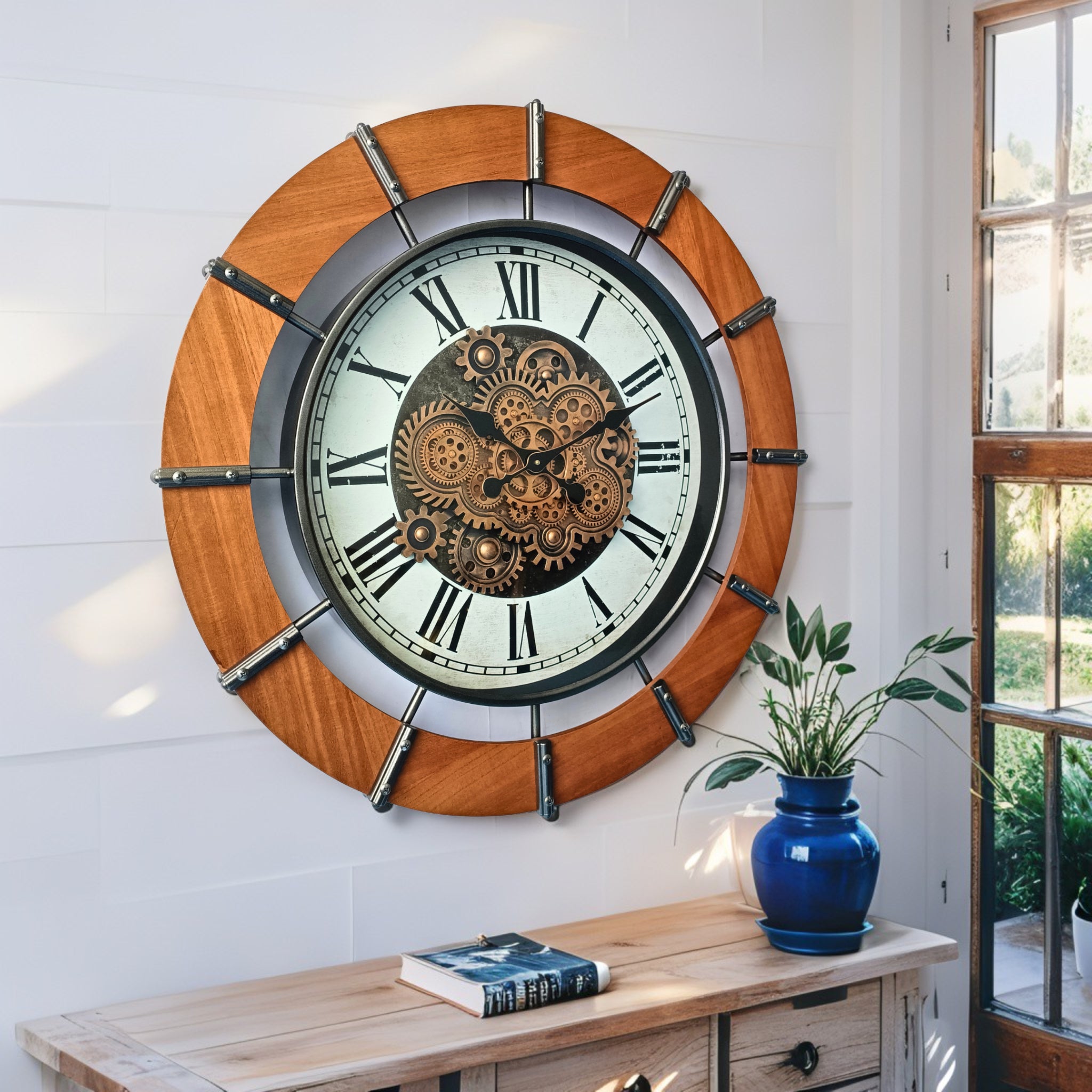STYLE: industrial-modern; brown wood-look ring, brushed-silver bezel; glass cover.