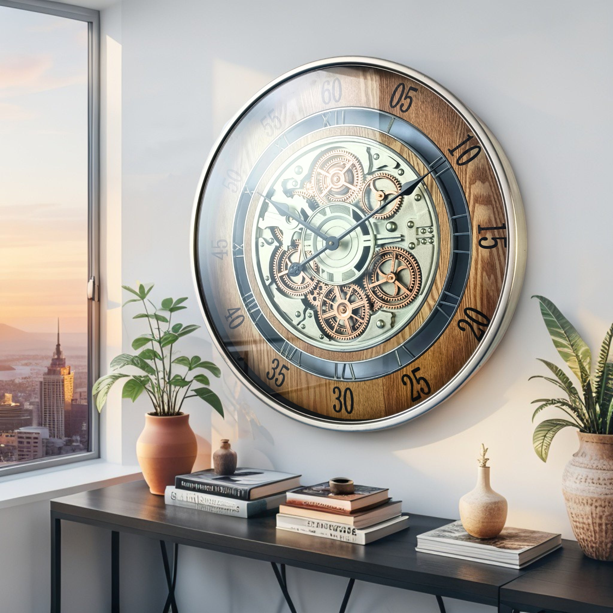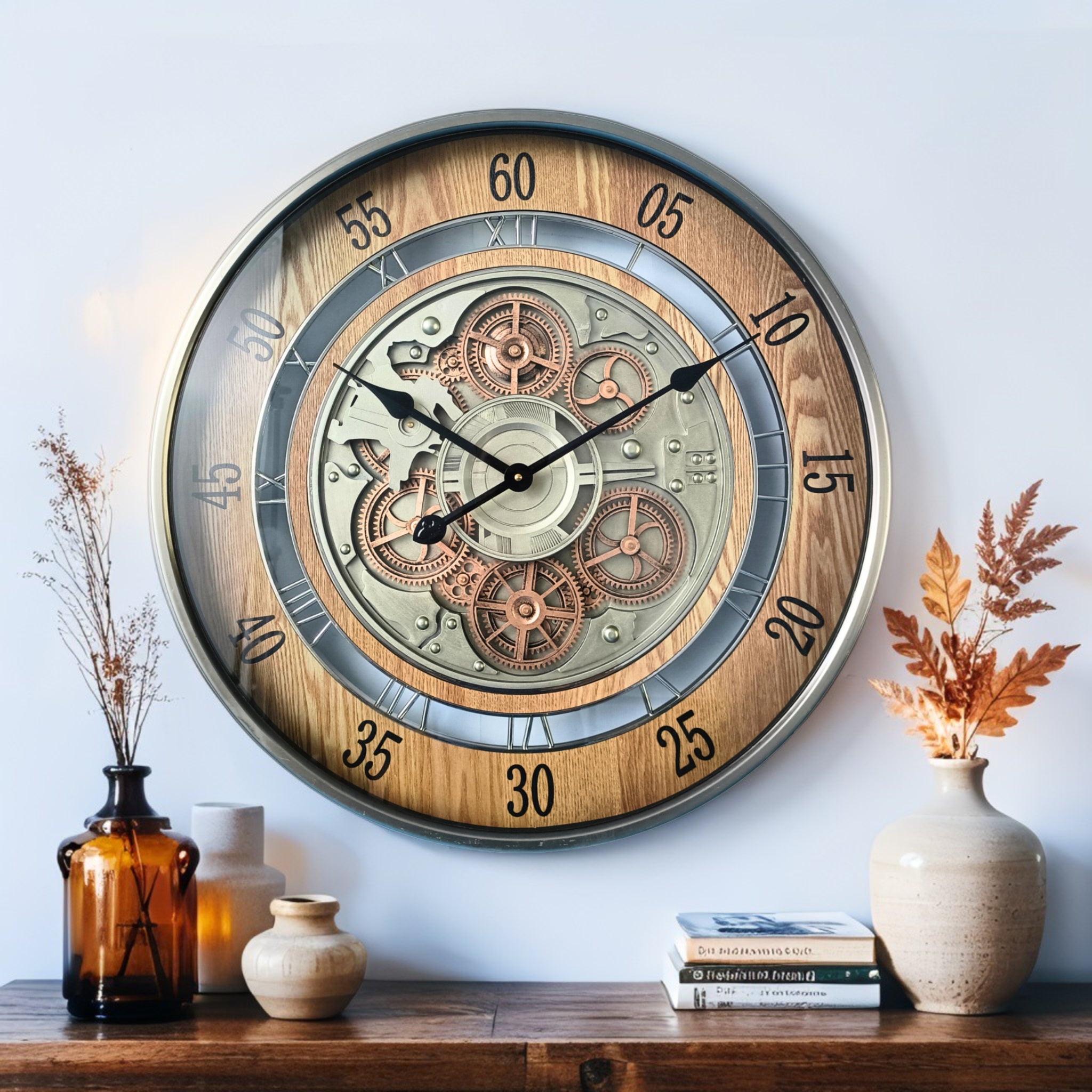 STYLE: industrial-modern; metal silver ring, brushed-silver bezel; wood clock face, and glass cover.