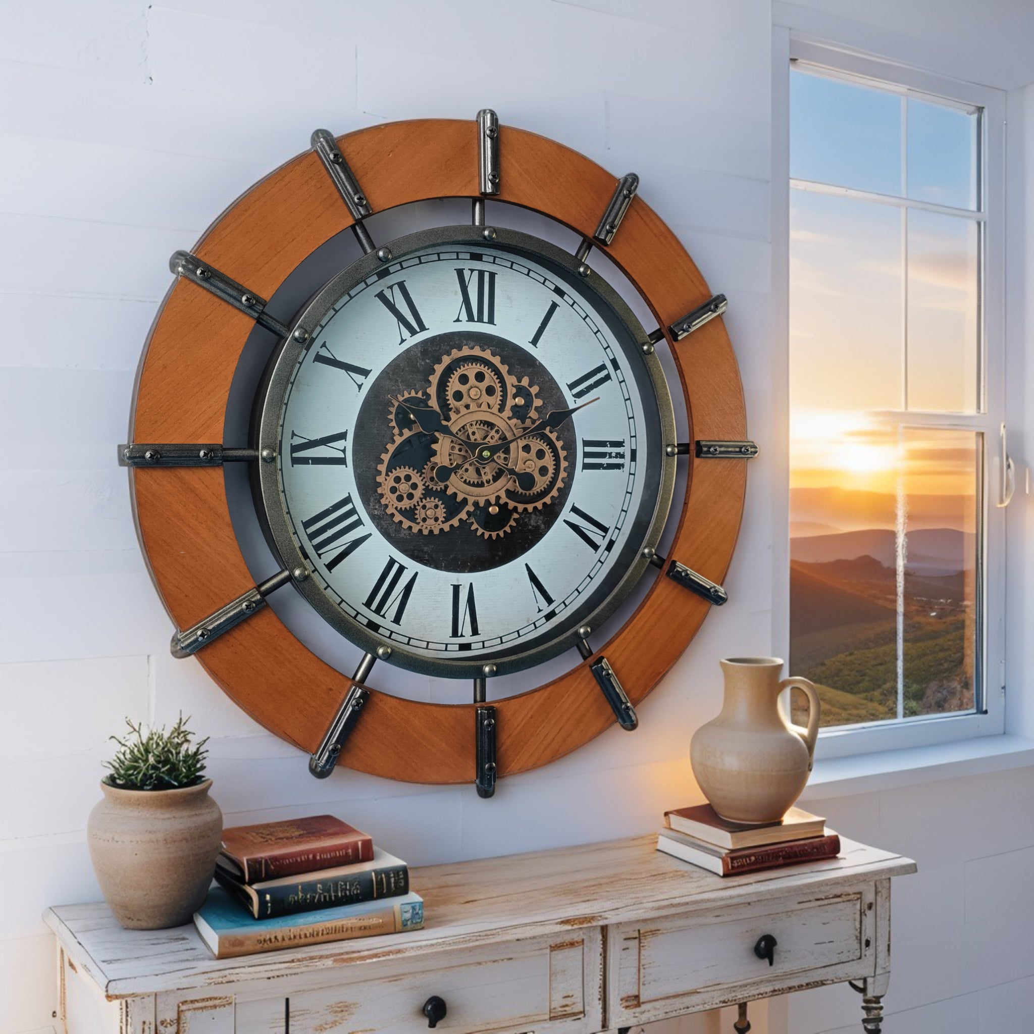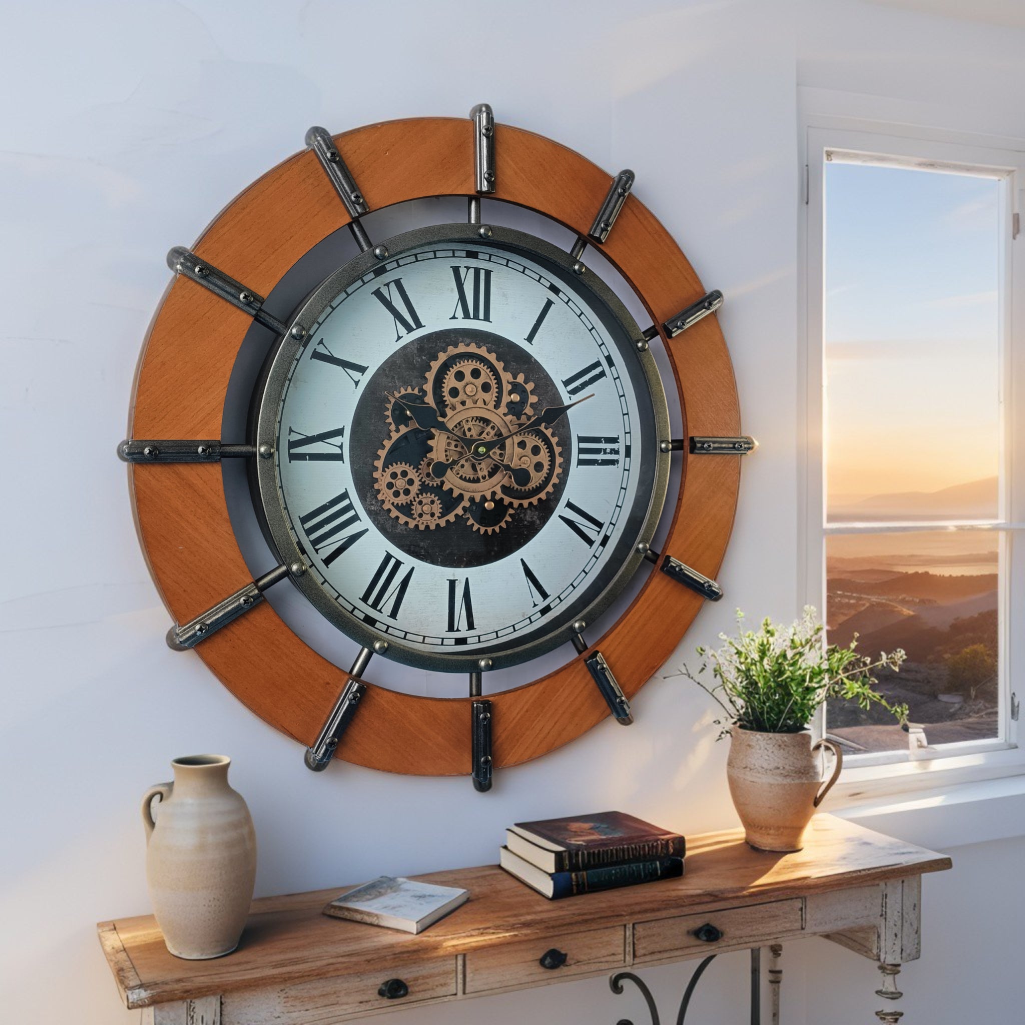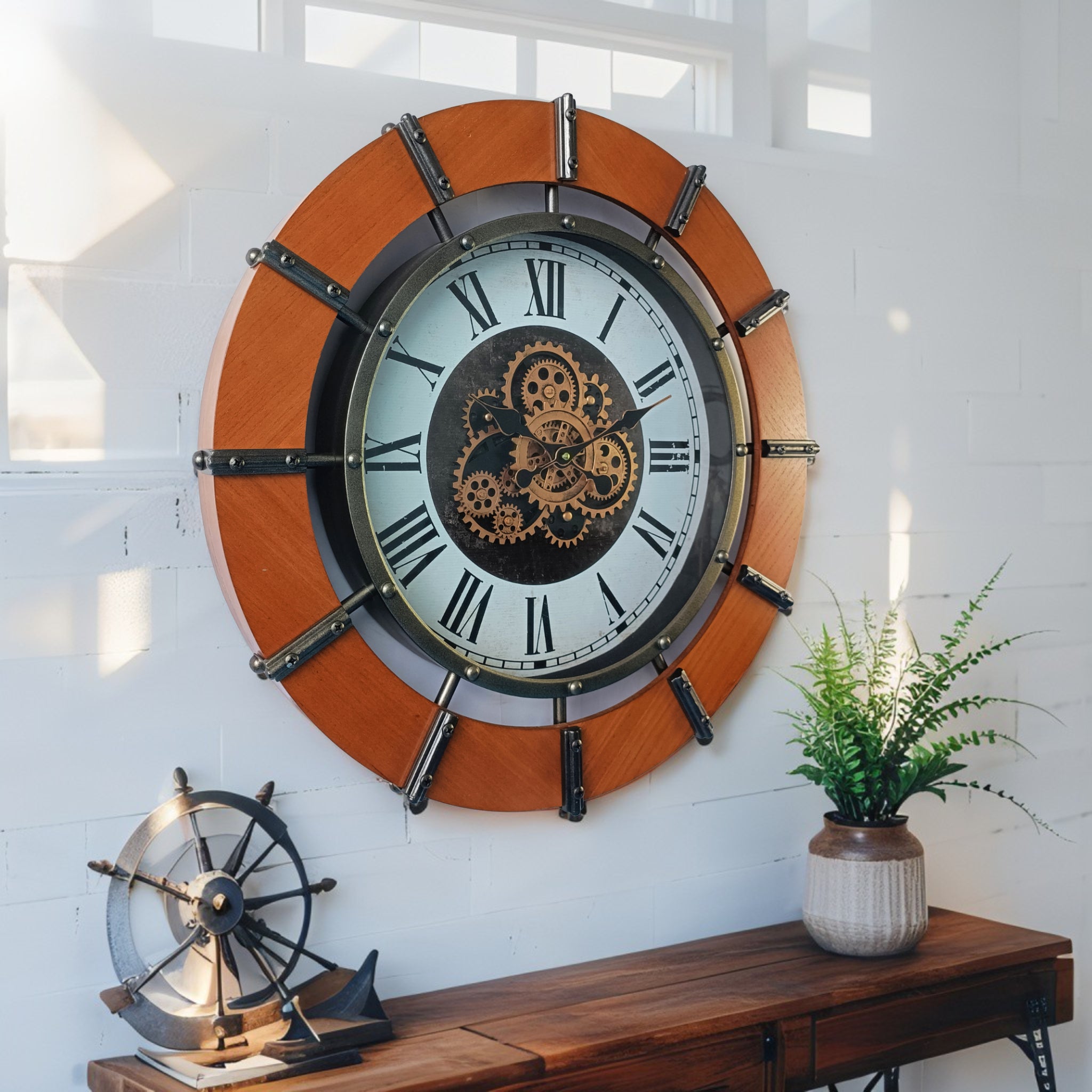 STYLE: industrial-modern; brown wood-look ring, brushed-silver bezel; glass cover.