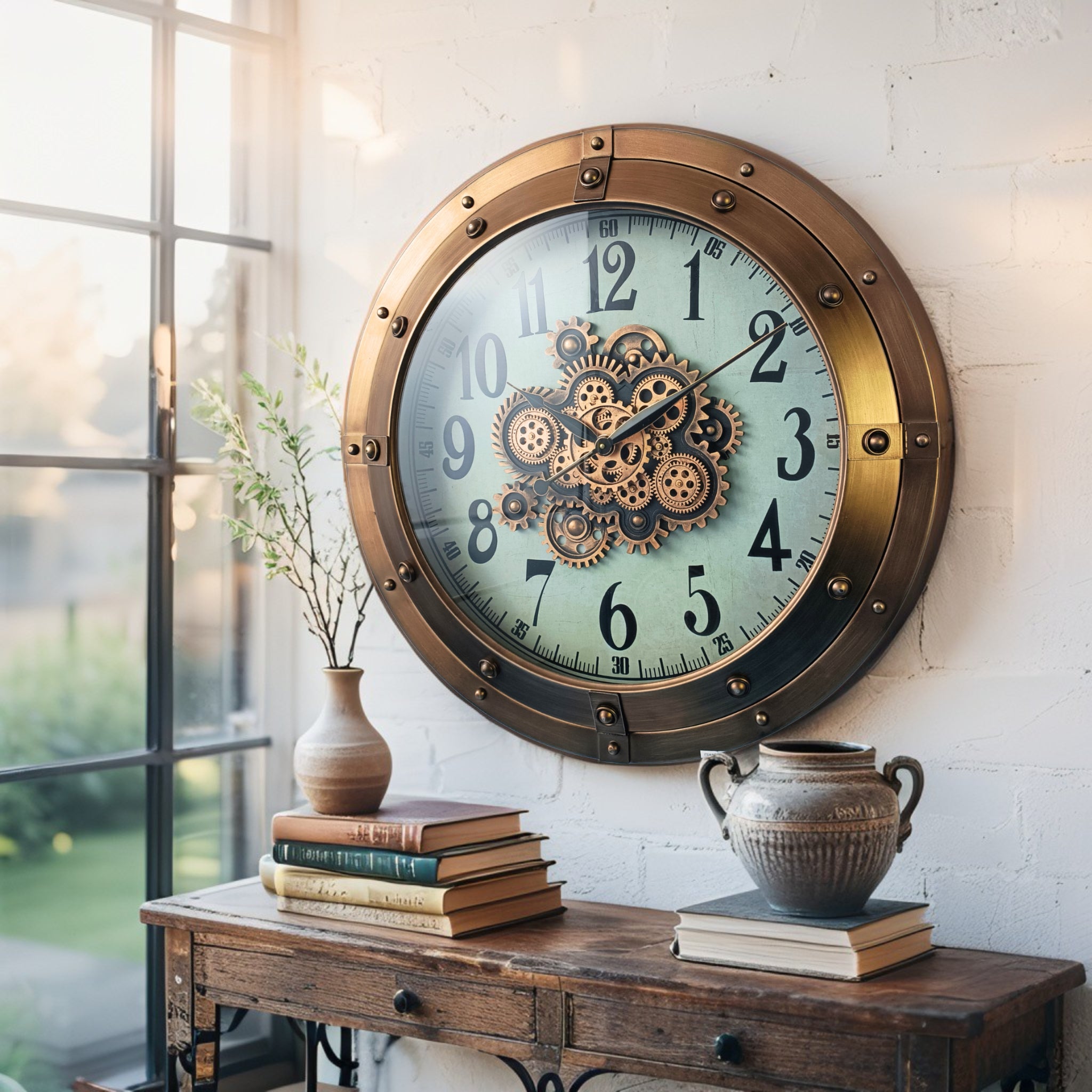 STYLE: industrial-modern; metal frame ring, brushed-silver bezel; glass cover.