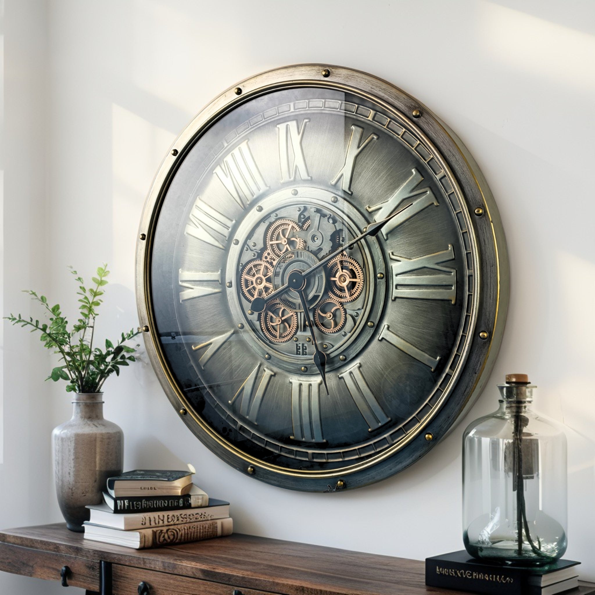 STYLE: industrial-modern; metal solid frame ring, brushed-silver bezel; glass cover.