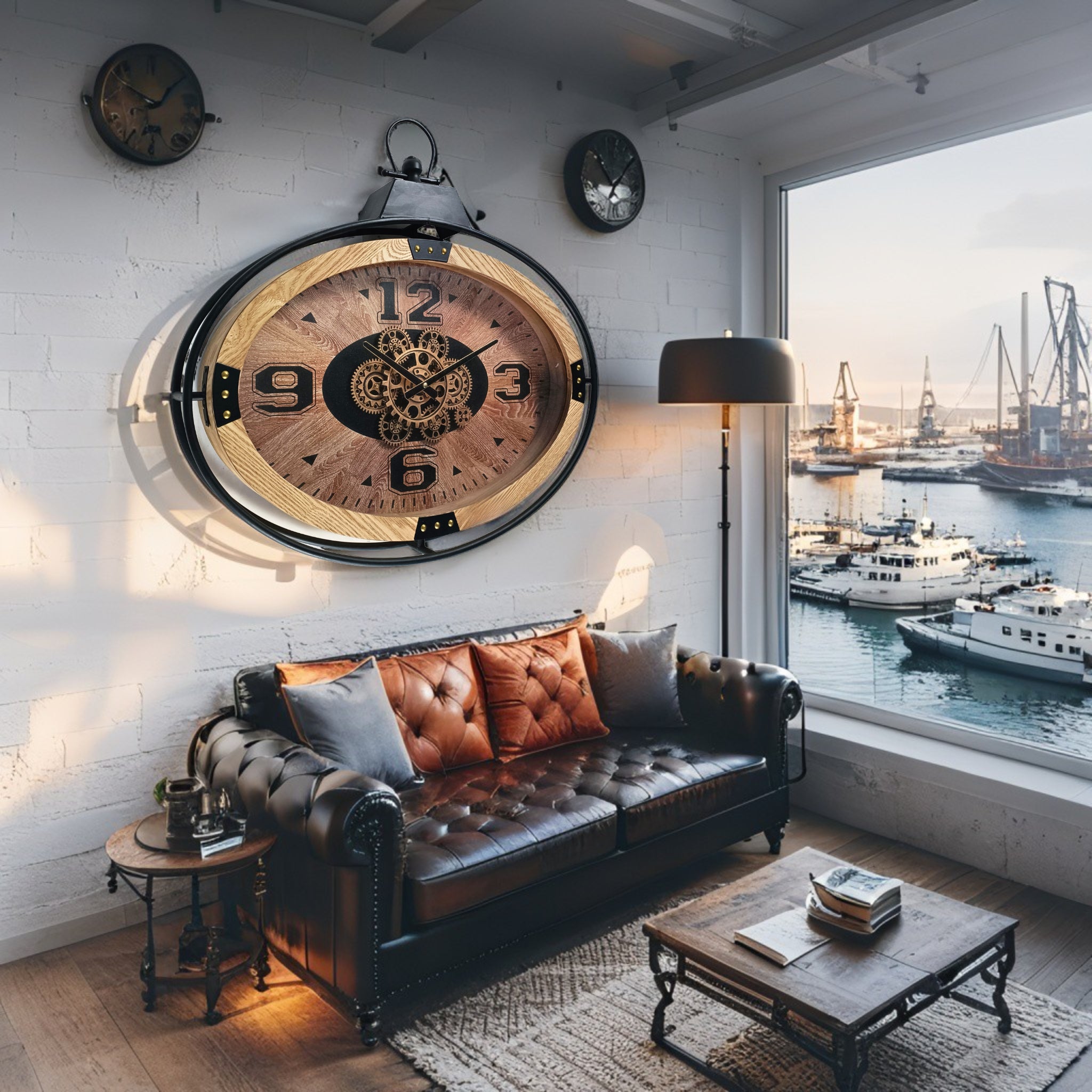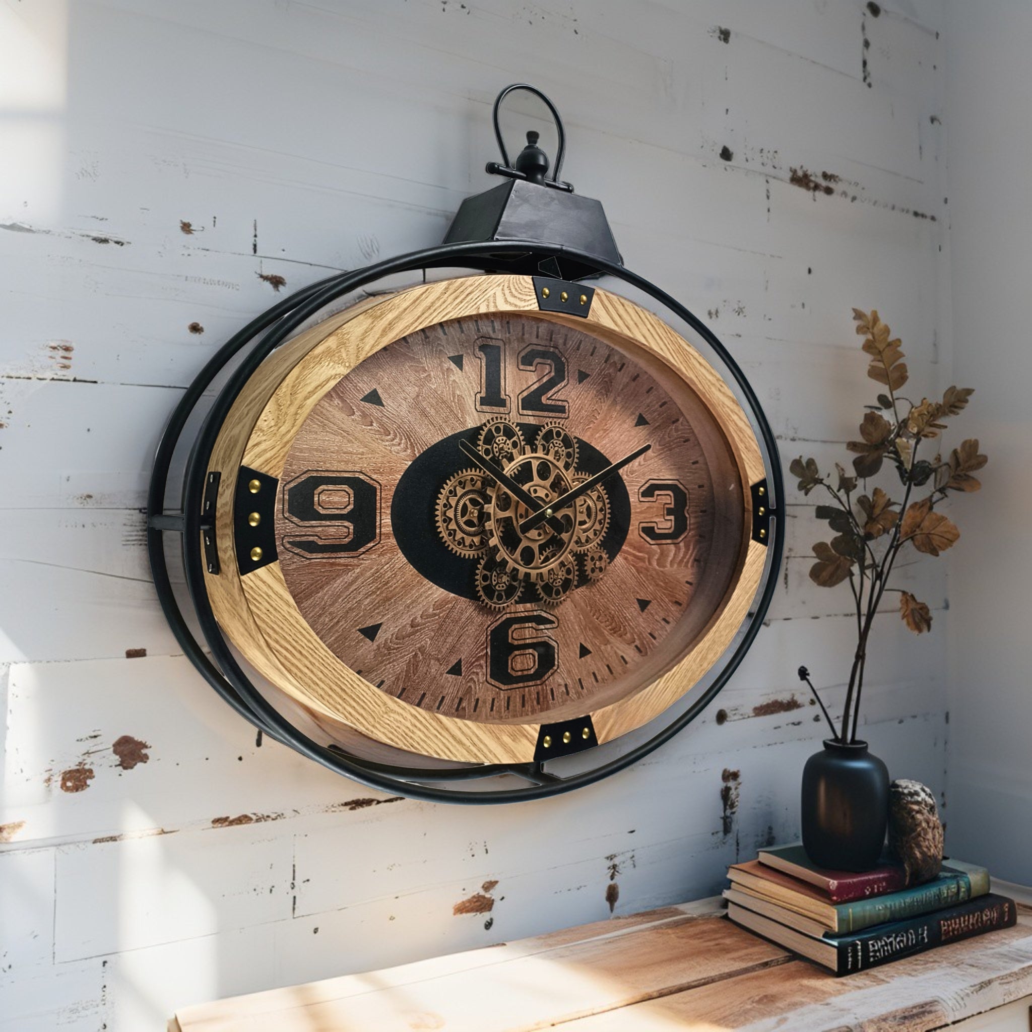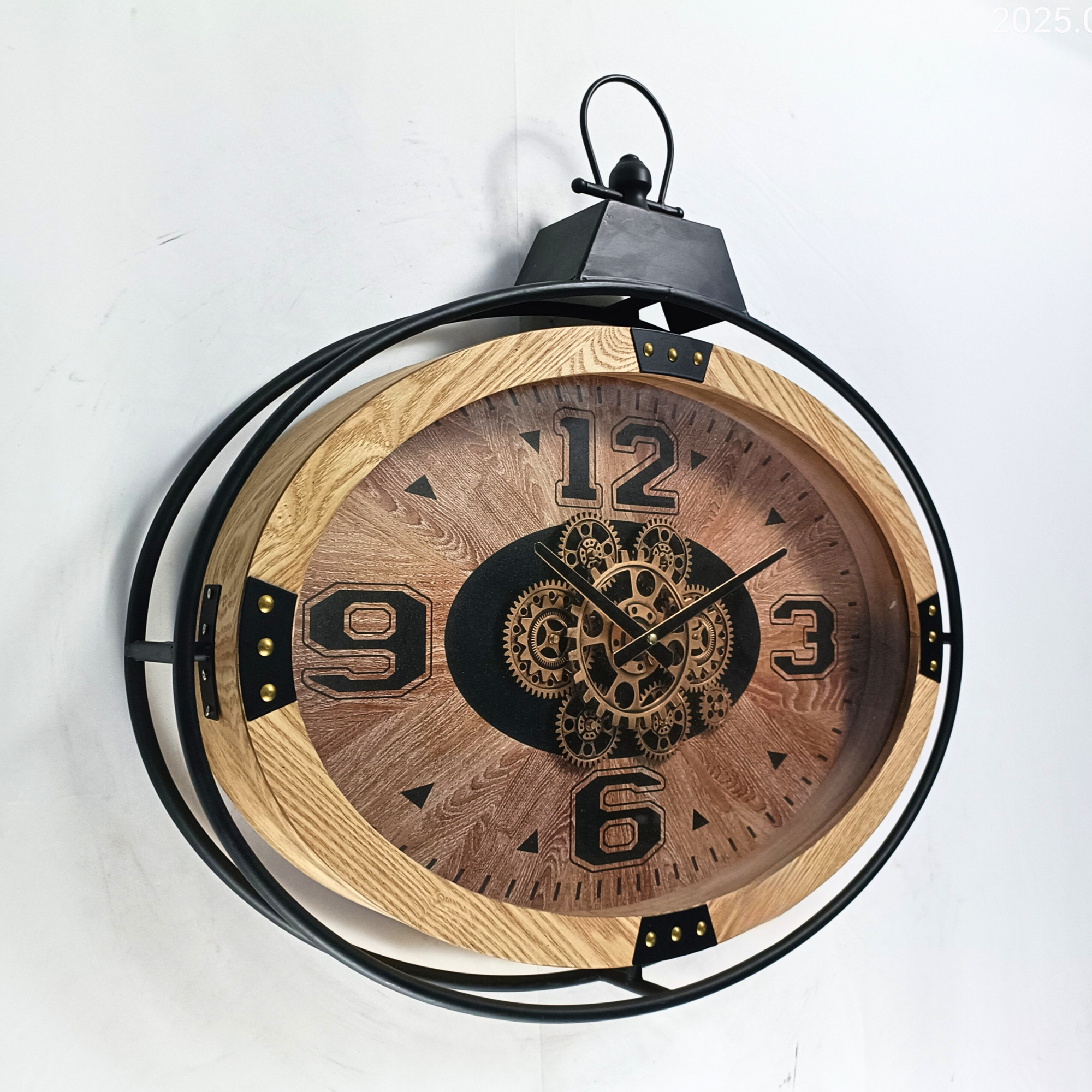 STYLE: industrial-modern; brown wood-look ring, brushed-silver bezel; glass cover.